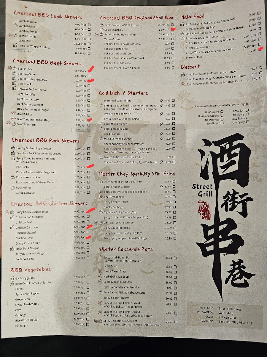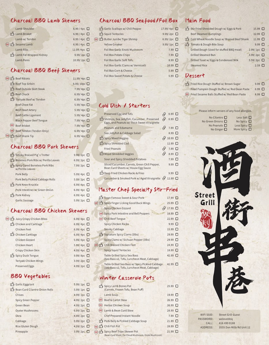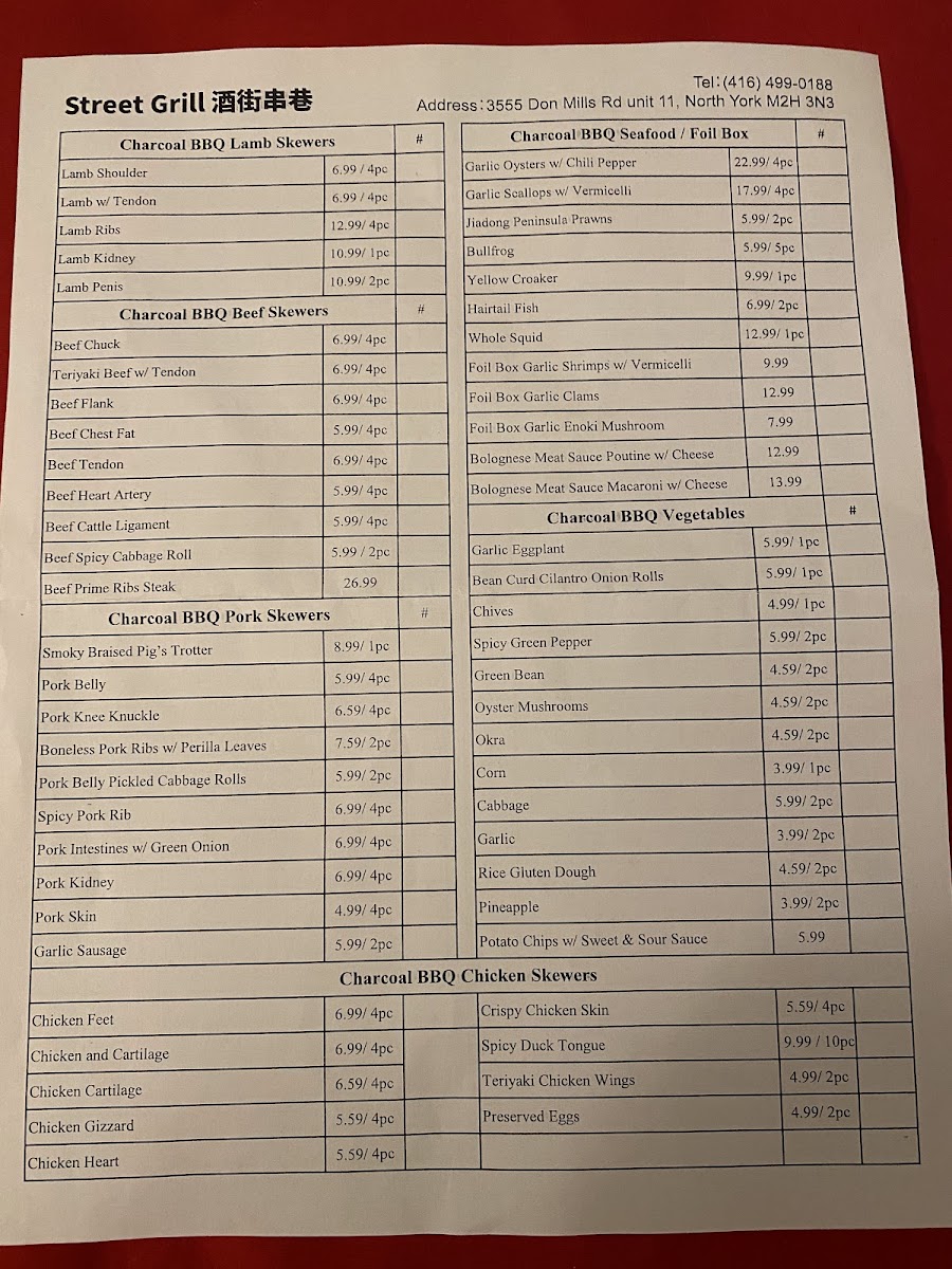 Welcome to Street Grill, a vibrant Chinese restaurant located at 3555 Don Mills Rd, North York, ON. This hidden gem specializes in smoky, flavorful skewers, offering an unbeatable value in the Greater Toronto Area.